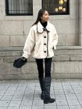 ふんわりとしたボア素材に、パイピングを効かせたスタンドカラーコート。