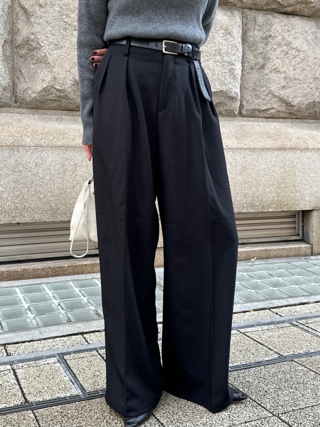 立体感のあるタック入りでウエストは周りはスッキリ見えるこだわりポイント。