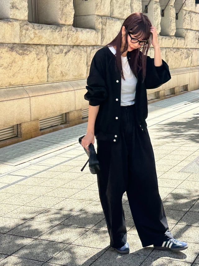 少しゆったりとしたサイズ感なので、ボリュームのあるトップスやニットの上に重ねてもすっきり着こなせます。