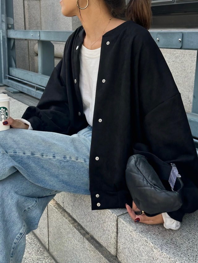 一枚でこなれ感が出るピーチスエード素材のスタジアムジャケット。