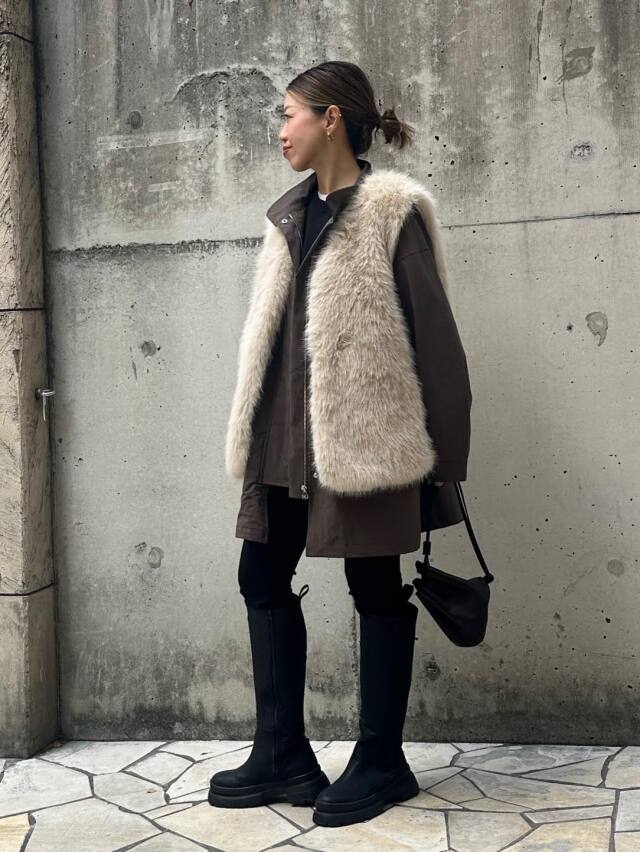 首元に高さを持たせることでモッズコート特有のカジュアル感を引き締め、都会的な印象に。